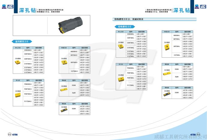 成都工具研究所有限公司长期从事内排屑深孔刀具的开发,致力于为用户深孔加工提供系统解决方案。近年来依托我公司在材料、涂层和深孔刀具设计制造等方面的综合优势,开发出了系列机夹式内排屑深孔钻。该深孔钻采用了新研制的高性能硬质合金基体材料和新的刀片表面涂层工艺,保证了刀具的高的切削寿命;通过对刀片几何形状、断屑槽形的优化设计,大大提高了刀片的切削强度以及刀具的切削效率,保证了高效深孔钻削加工的要求;通过对刀体结构的优化设计,保证了超长深孔加工的直线度,加工深孔零件的长径比达到国际先进水平。成都工具有限公司生产的机夹式内排屑深孔钻直径范围为φ25~φ160mm,并可生产各种规格的机夹式扩孔钻。φ25~φ65的机夹式内排屑深孔钻采用沉孔螺钉直接将可转位刀片固定在刀体上的结构形式;φ65以上的机夹式内排屑深孔钻采用带刀座的结构形式,沉孔螺钉直接将可转位刀片固定在刀座上,同时刀座用螺钉固定在刀体上。针对特殊难加工材料以及用户加工条件的不同,专门开发了不同的刀片材质、不同的刀片涂层工艺、不同的刀片几何形状、不同的断屑槽型以及不同的刀具结构,最大限度地满足各种用户的不同需求。机夹式内排屑深孔钻加工孔的精度达到IT10级,表面粗糙度达Ra3.2,可替代进口产品。
