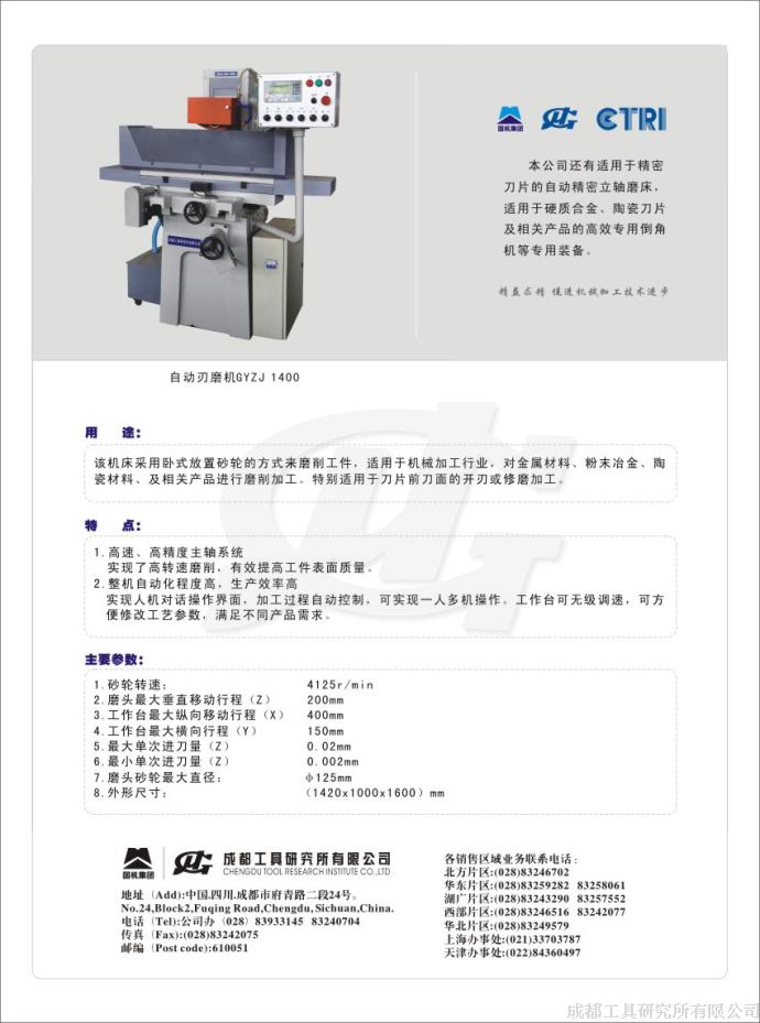 成都工具研究所有限公司拥有适用于精密刀片的自动精密立轴磨床,适用于硬质合金、陶瓷刀片及相关产品的高效专用倒角机等专用装备。